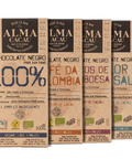 Our organic dark chocolate bars are made with simple ingredients and crafted in small batches to highlight the natural taste of cocoa. Each bar weighs 100 g and is available in four varieties. For those who want to try them all, there is also a variety pack with one bar of each flavor.